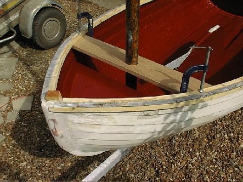 At last a positive step forward. The painting of the inside of the hull is finished, and the mast support (forward thwart) is in place and the is glue hardening overnight. I couldn't resist taking a pic with the mast in place - looks something like a proper boat at last. I'll post details of the fixing of the thwart later; but for now, in the words of the execrable Maggie, "Rejoice!"