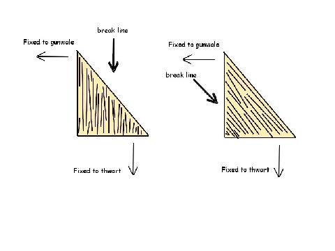 You can see from the diagram that when the grain runs vertically, if the wood splits, the thwart would detach from the gunwale; whereas if the grain runs diagonally the thwart will not become detached even if the wood splits.