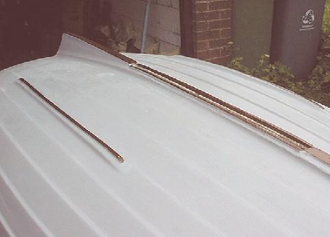 The past three days have all been spent on the keel band and bilge runners. They're of English red oak and although not very thick they're almost tough enough. The most difficult bit was around the centre plate opening. I originally intended to make the whole keel band in one piece, but it was just too complex because of the original shape of the hull (it went up and down in the middle like nobody's business). So there are separate pieces each side and fore and aft of the opening. It's all held together with SP Systems best Epoxy Resin so it ain't gonna fall apart. The photos show it and the bilge runners finished and coated with epoxy. The next job (which may get done before the end of the day if the showers stop) is to undercoat the outside of the hull. Not long until we turn it back over for the finishing touches.